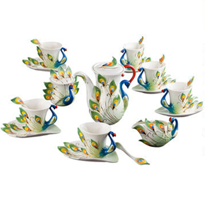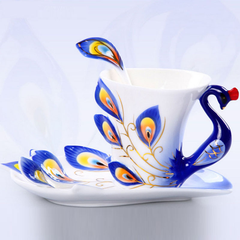 珐琅瓷孔雀杯具套装 西式创意陶瓷咖啡杯 婚庆会议送礼