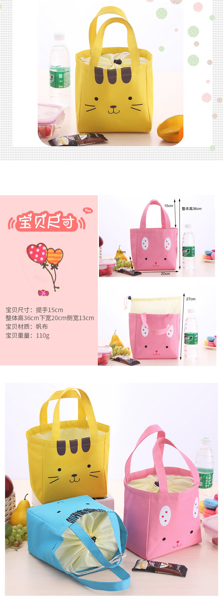 商品名称:卡通手提保温便当包 饭盒收纳袋--粉色