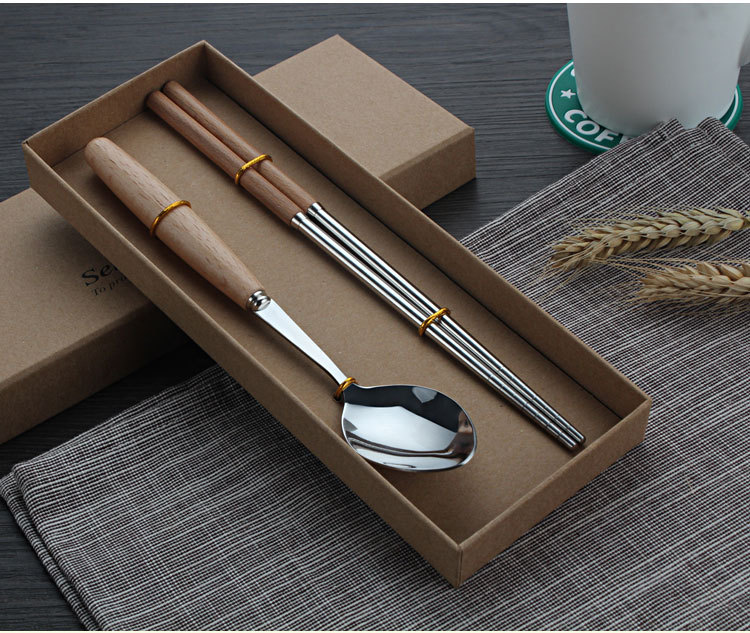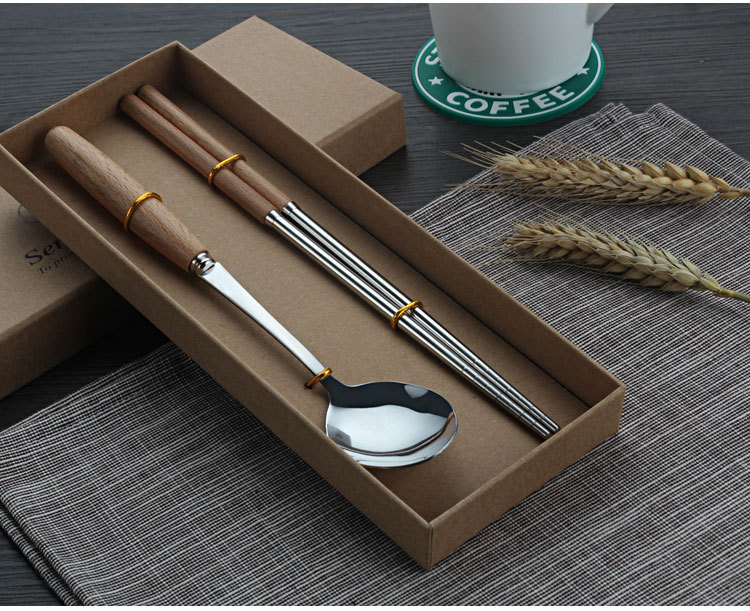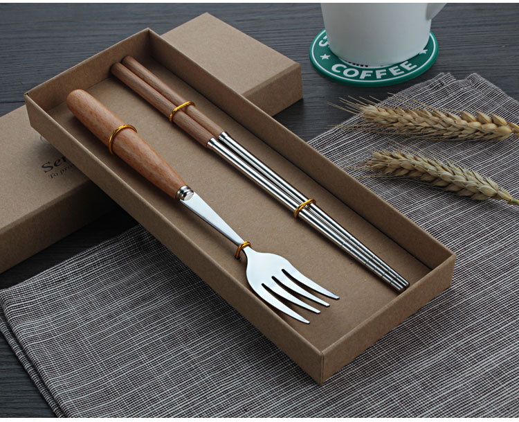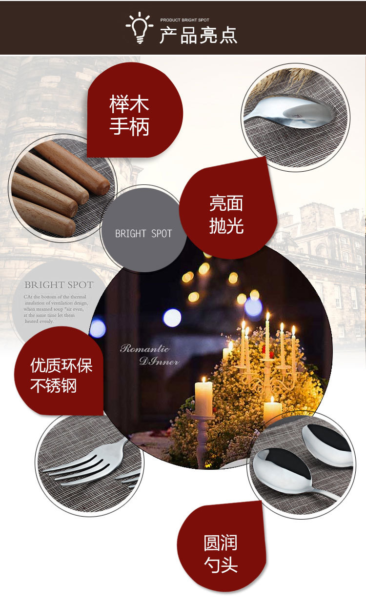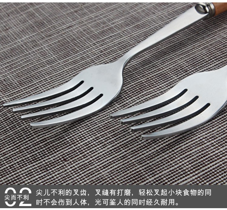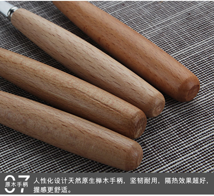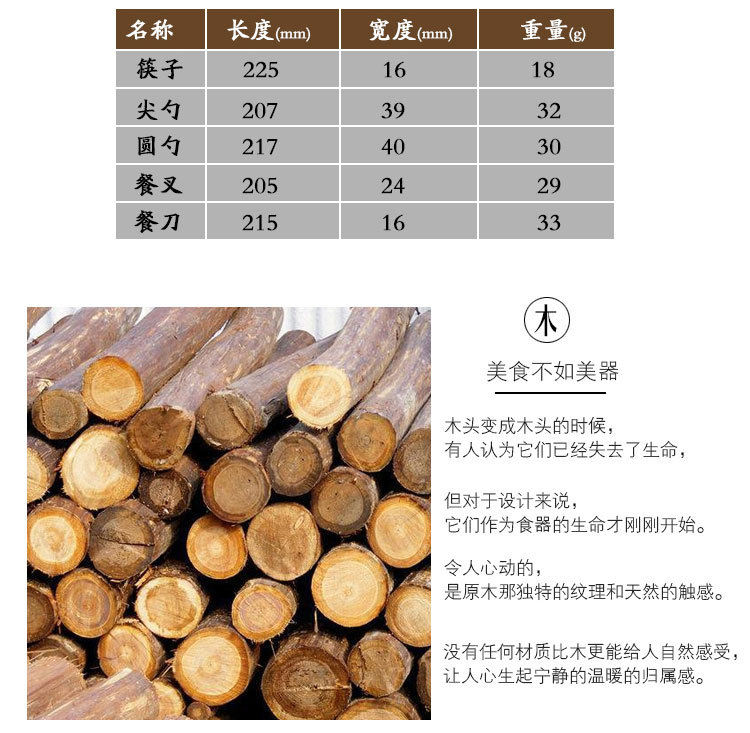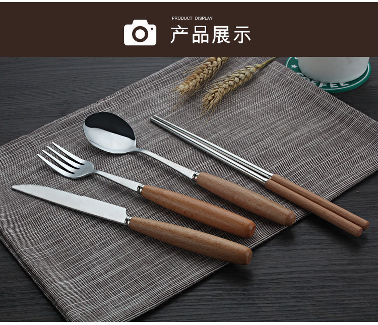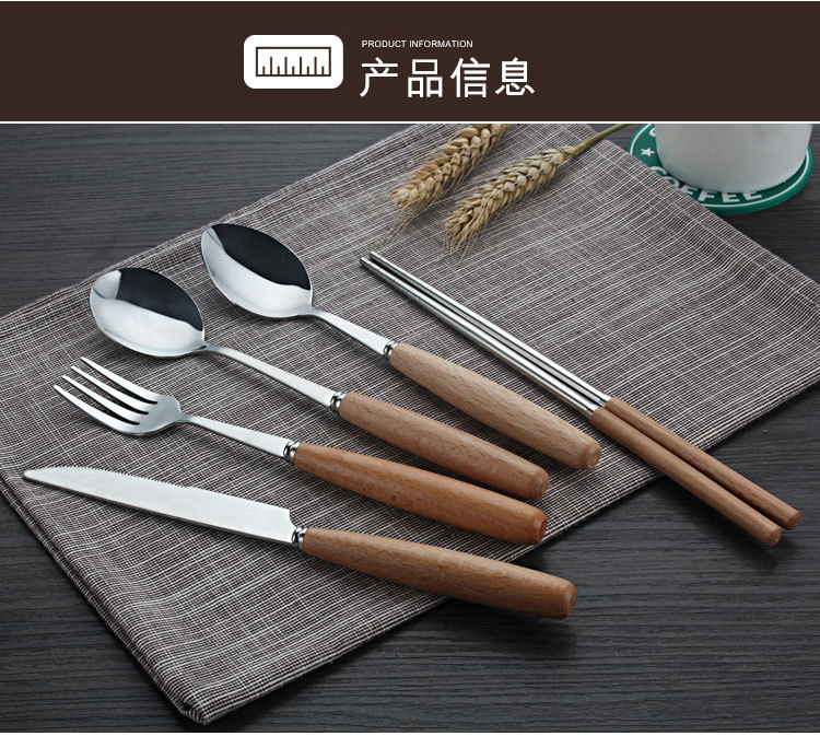 商品名称:原木不锈钢西餐具套装 榉木柄刀叉勺筷子四件套(圆勺)