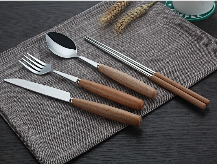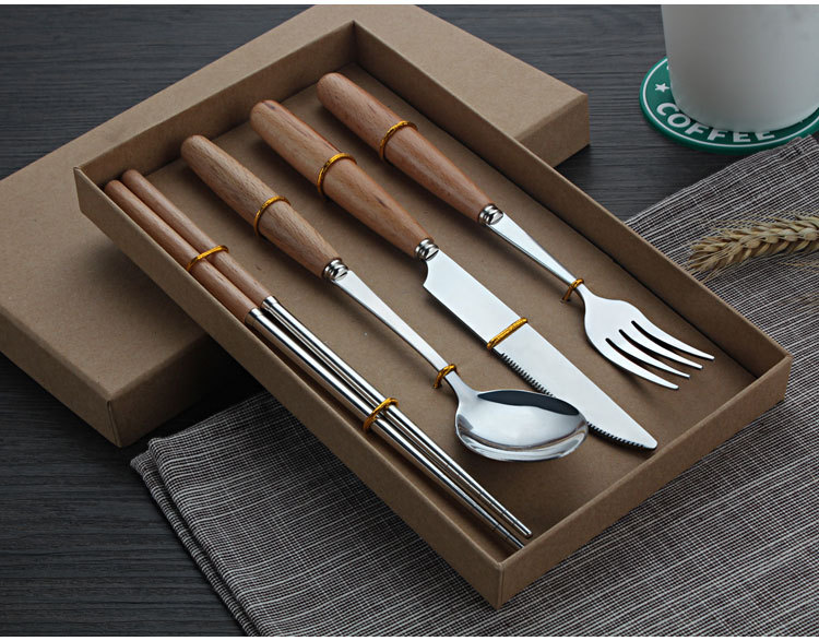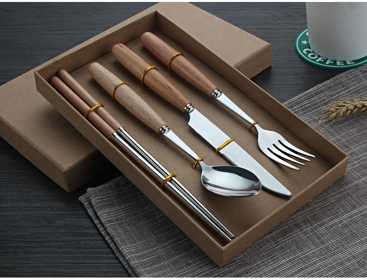 原木不锈钢西餐具套装 榉木柄刀叉勺筷子四件套(圆勺)