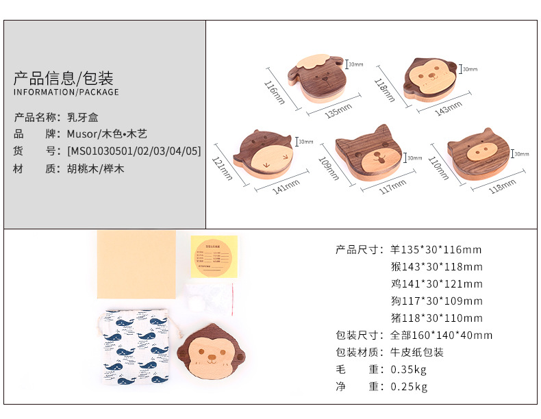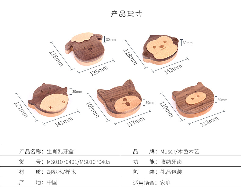 商品名称:MUSOR 生肖乳牙盒羊猴鸡狗猪 全实木牙齿保存收纳盒 婴儿礼品送什么好