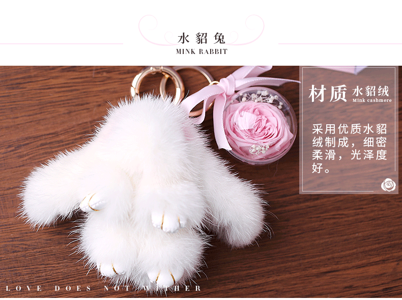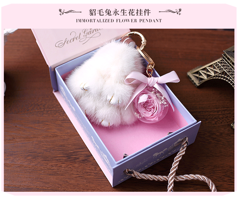 商品名称:貂毛兔永生花挂件钥匙扣 玫瑰保鲜花包包挂饰 时尚创意礼品