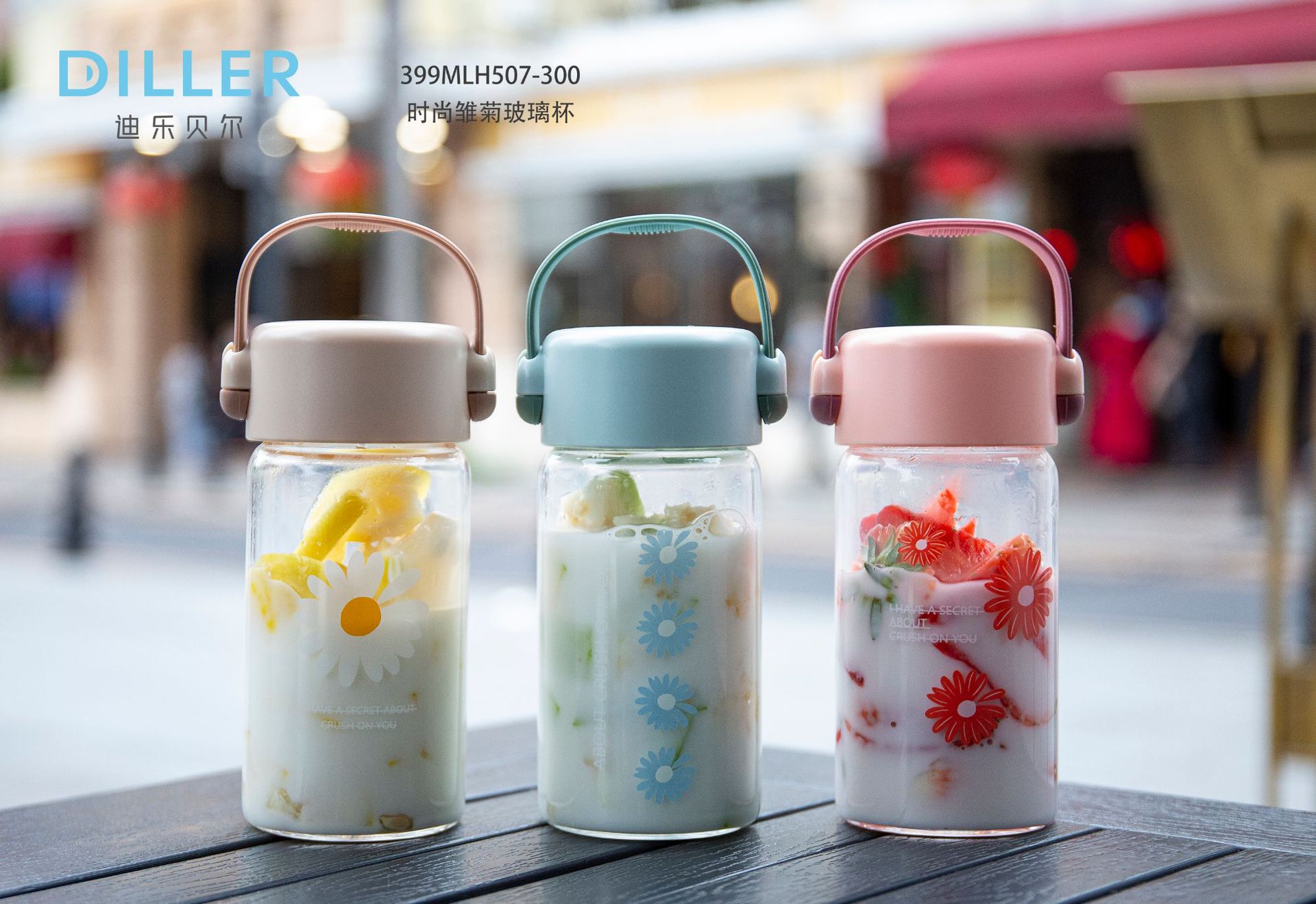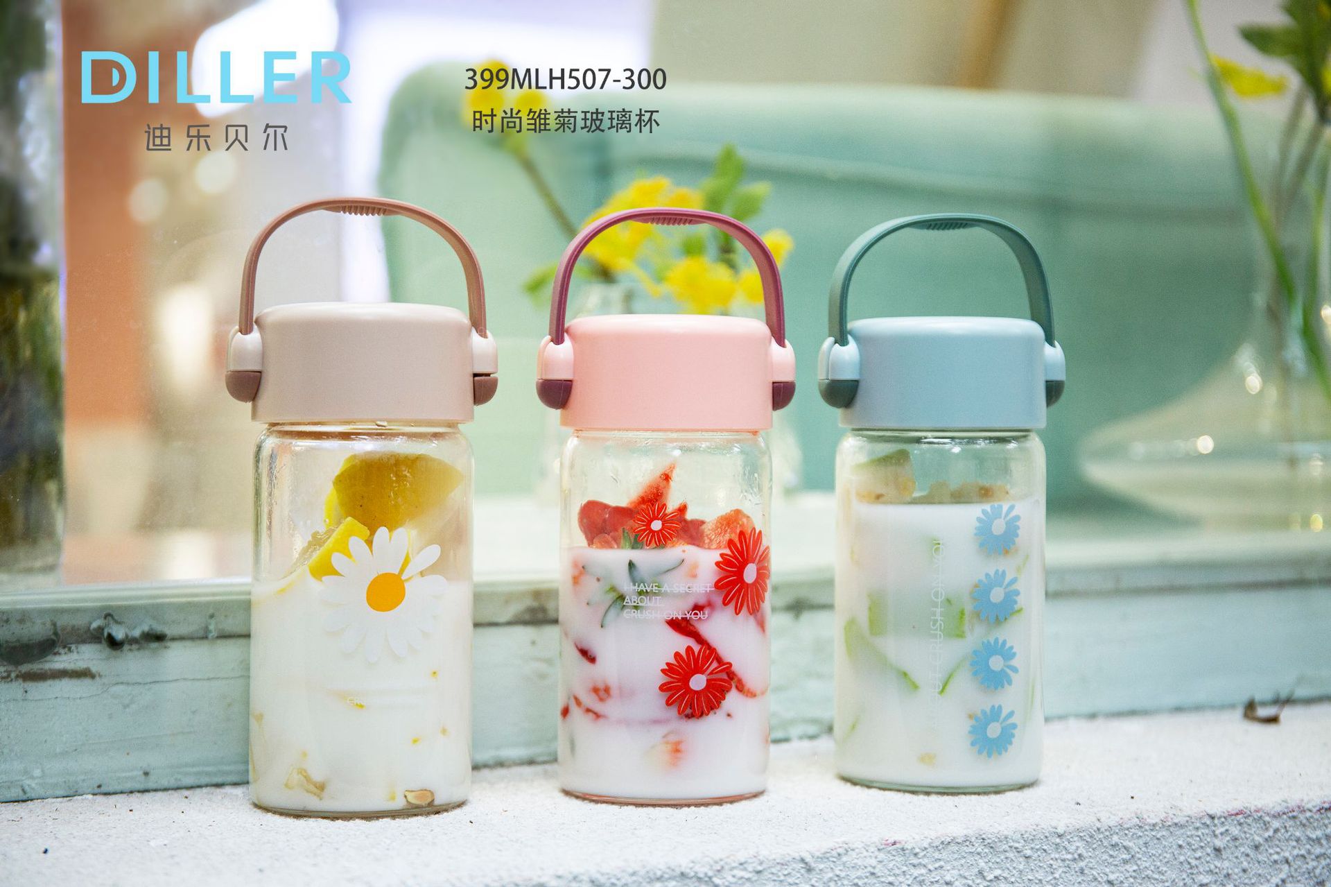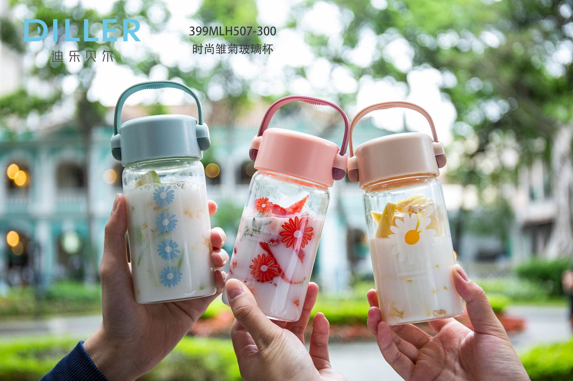 时尚小雏菊玻璃杯 带提手随行杯 韩版小清新水杯300ML 开业小礼品