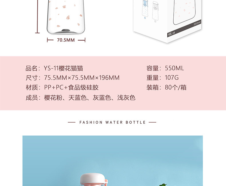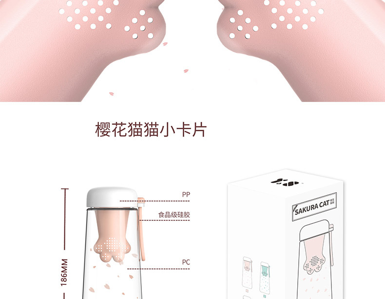商品名称:可爱猫爪随手杯550ML 樱花猫猫带茶漏塑料杯 猫咪透明水杯 随手礼赠品