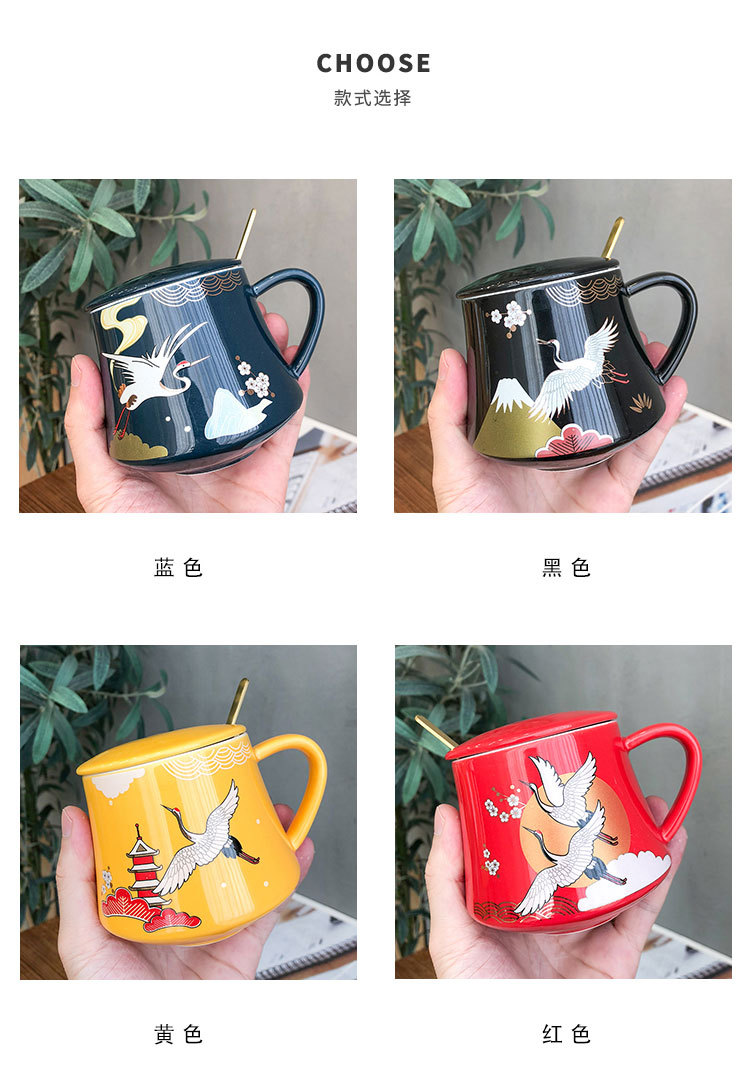 国潮风 复古仙鹤马克杯 陶瓷杯带盖带勺 茶杯咖啡杯 实用小礼品