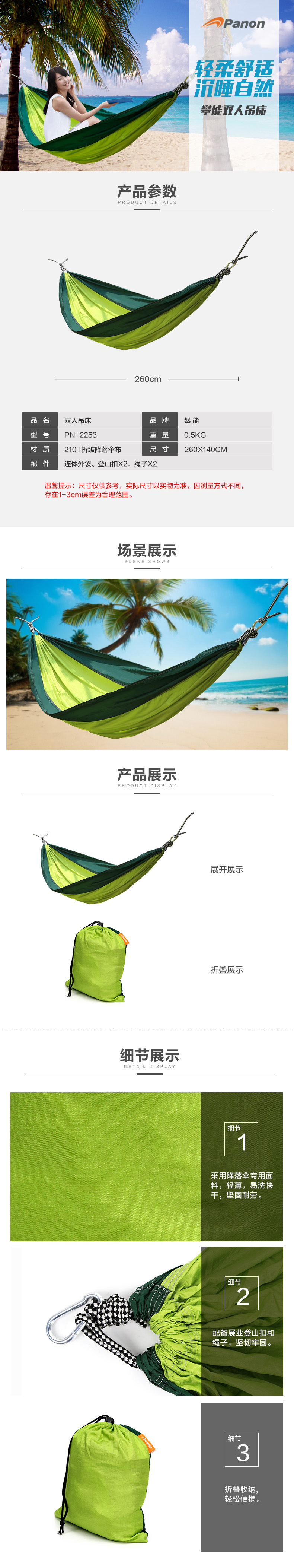 商品名称:攀能(Panon)户外多功能双人吊床 吊床、秋千、野餐垫、双人座 PN-2253