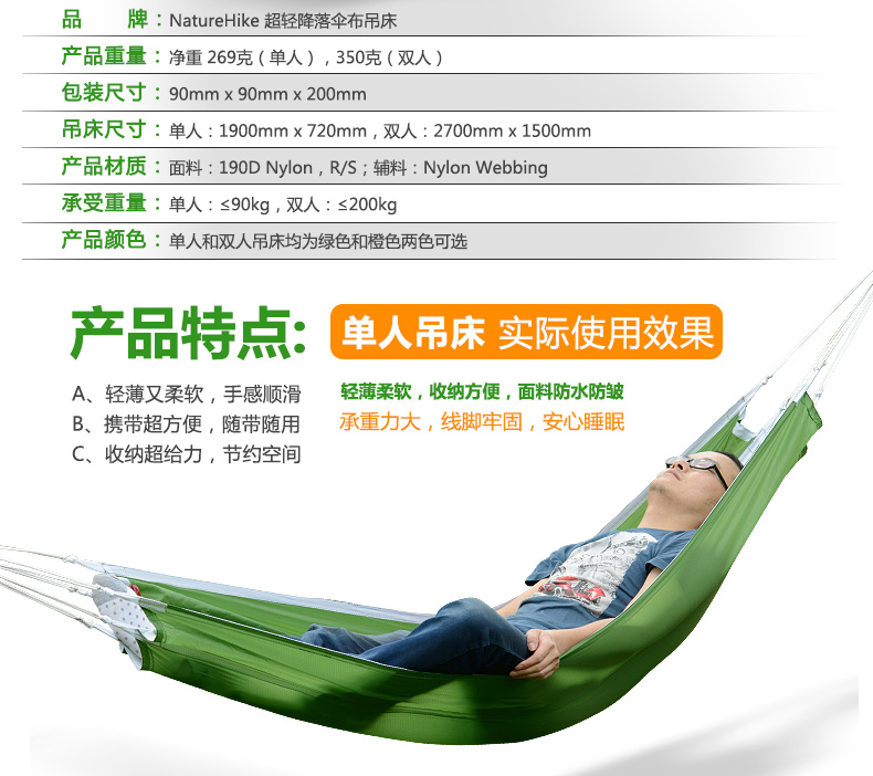 商品名称:Naturehike 超轻户外吊床 降落伞布吊床 单人休闲吊床