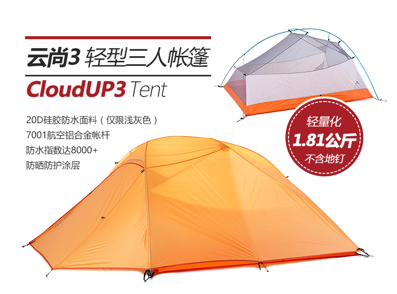 商品名称:Naturehike 云尚三人帐篷 户外露营铝杆帐篷 20D涂硅胶双层防暴雨
