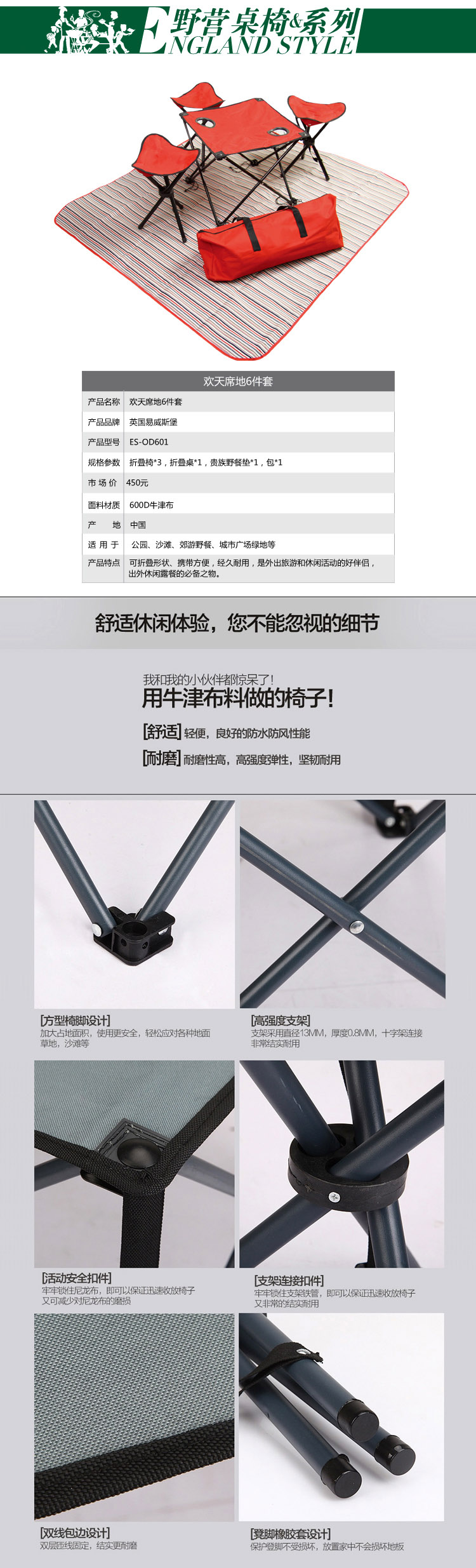 商品名称:易威斯堡(EasySport)可移动的餐厅 欢天席地6件套 户外折叠桌椅套装 户外礼品