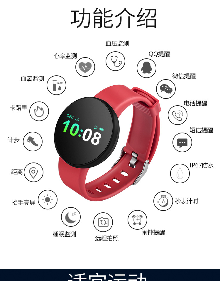 商品名称:防水运动手环Plus 运动记录 心率监测 超长待机 摇一摇拍照 短信微信QQ提醒 多功能智能手环 随身智能礼品