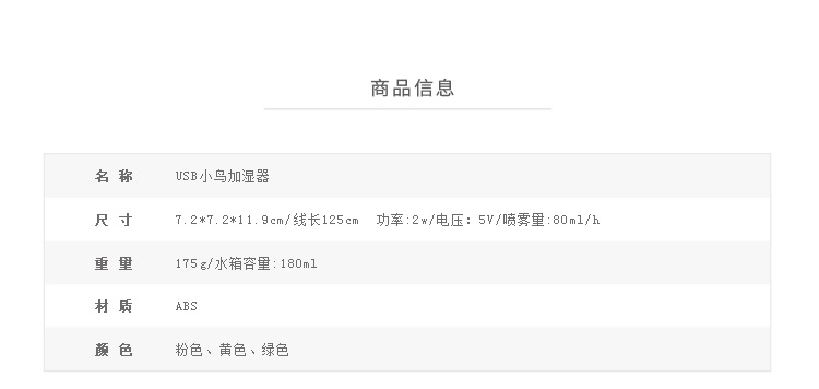 商品名称:可爱小鸟加湿器 创意USB迷你静音桌面加湿器