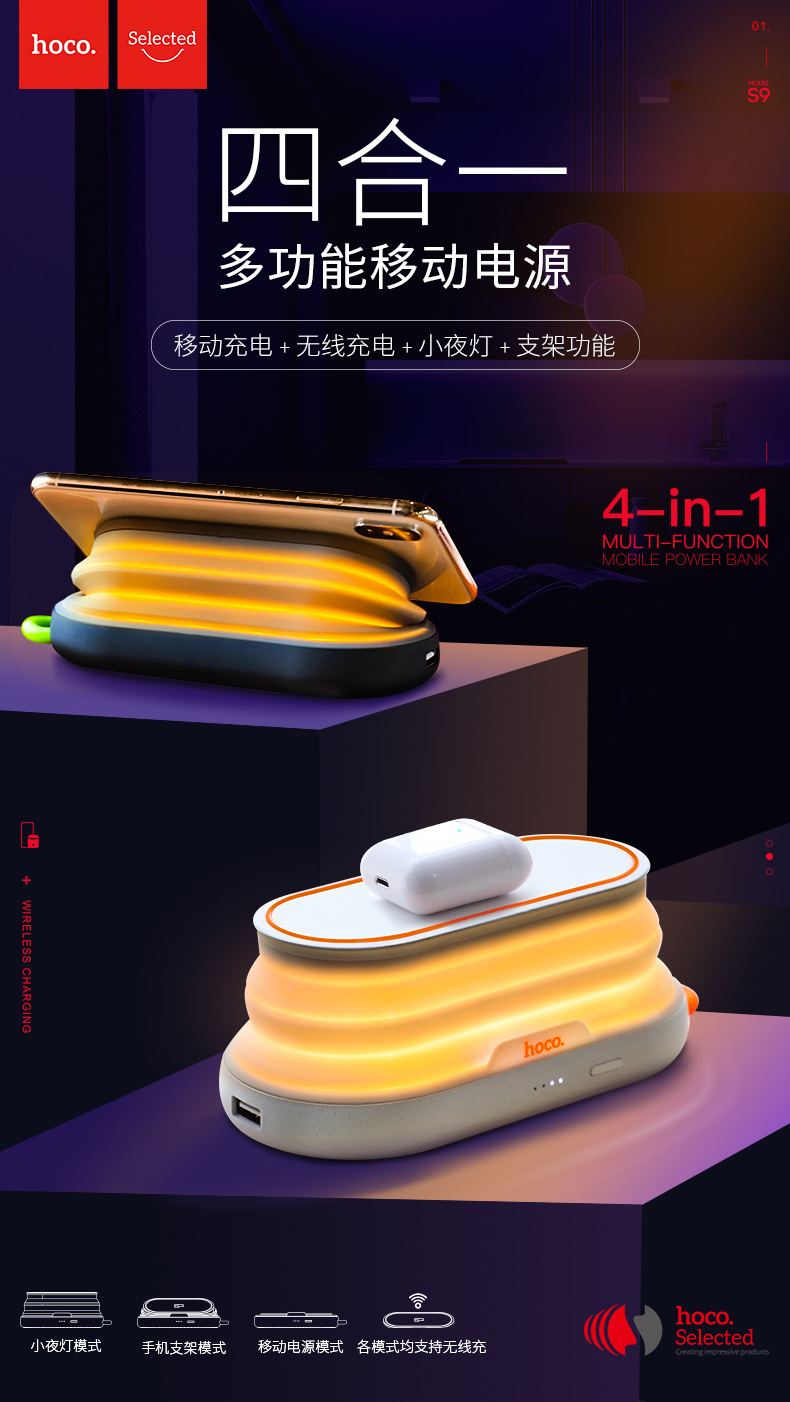 hoco premium product 四合一多功能移动电源 便携式小夜灯 无线充电宝手机支架 创意数码礼品定制 科技小礼品
