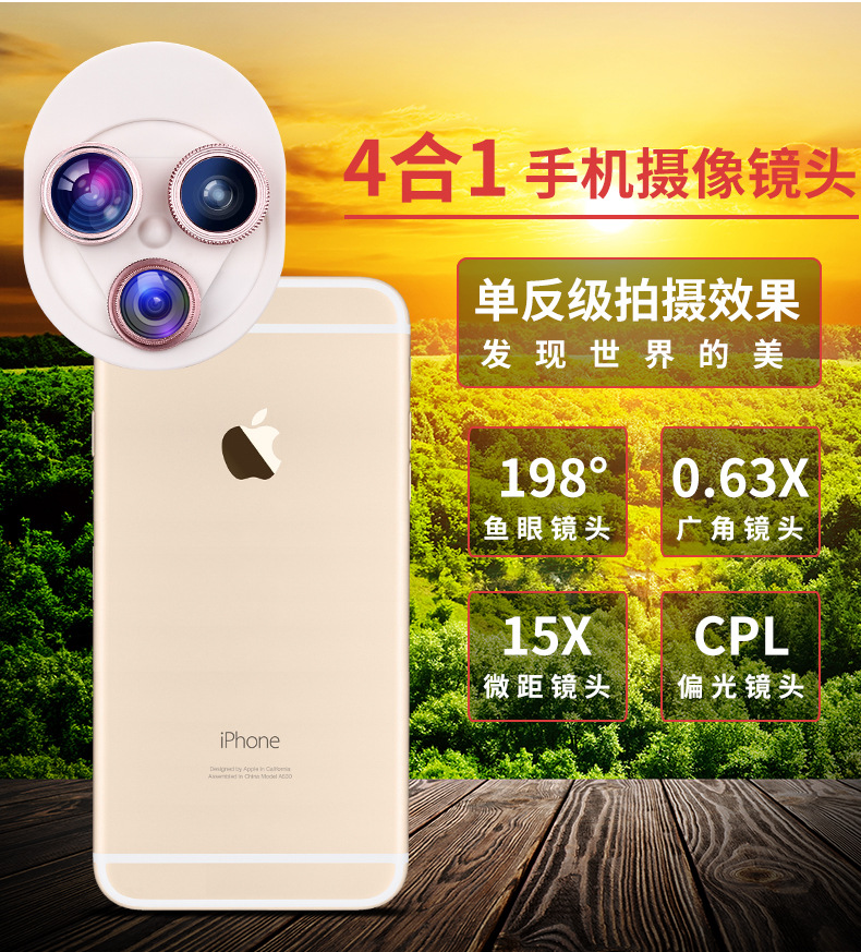 通用一体式可旋转手机镜头198°鱼眼 0.63x广角 微距 偏光镜四合一套装 精美潮礼