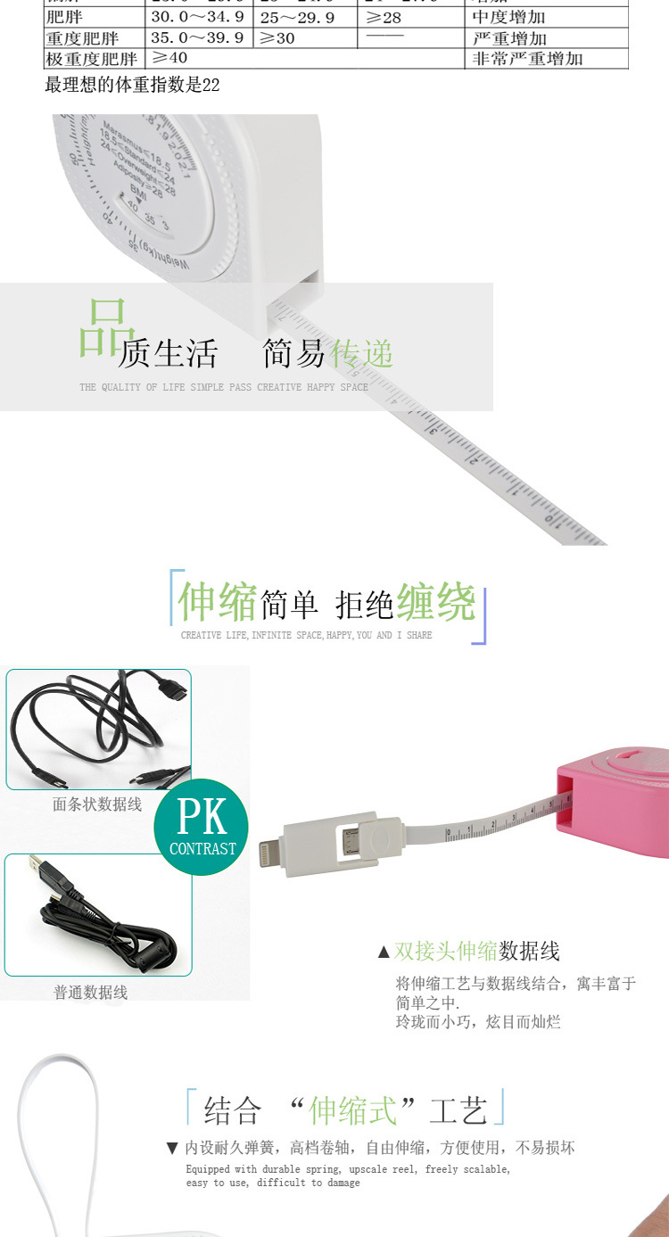 商品名称:BMI个人健康指数多功能创意卷尺数据线 二合一苹果安卓数据线礼品