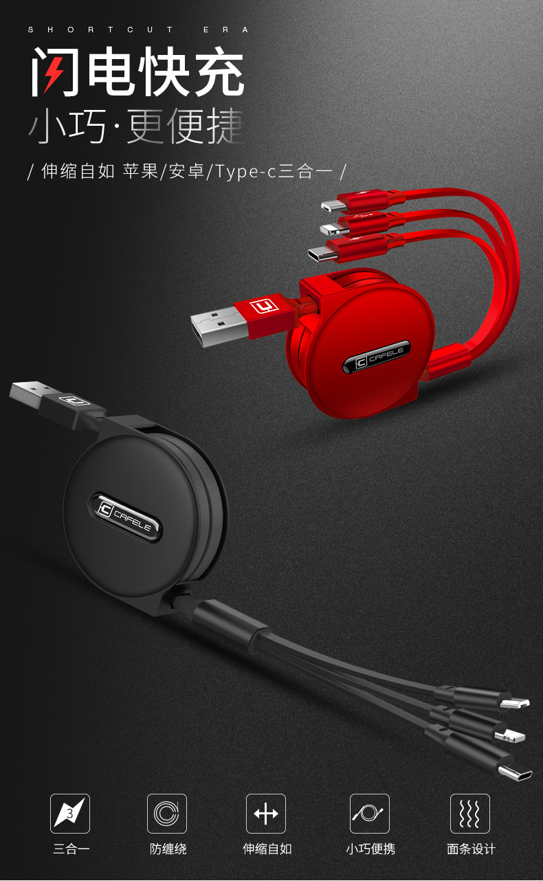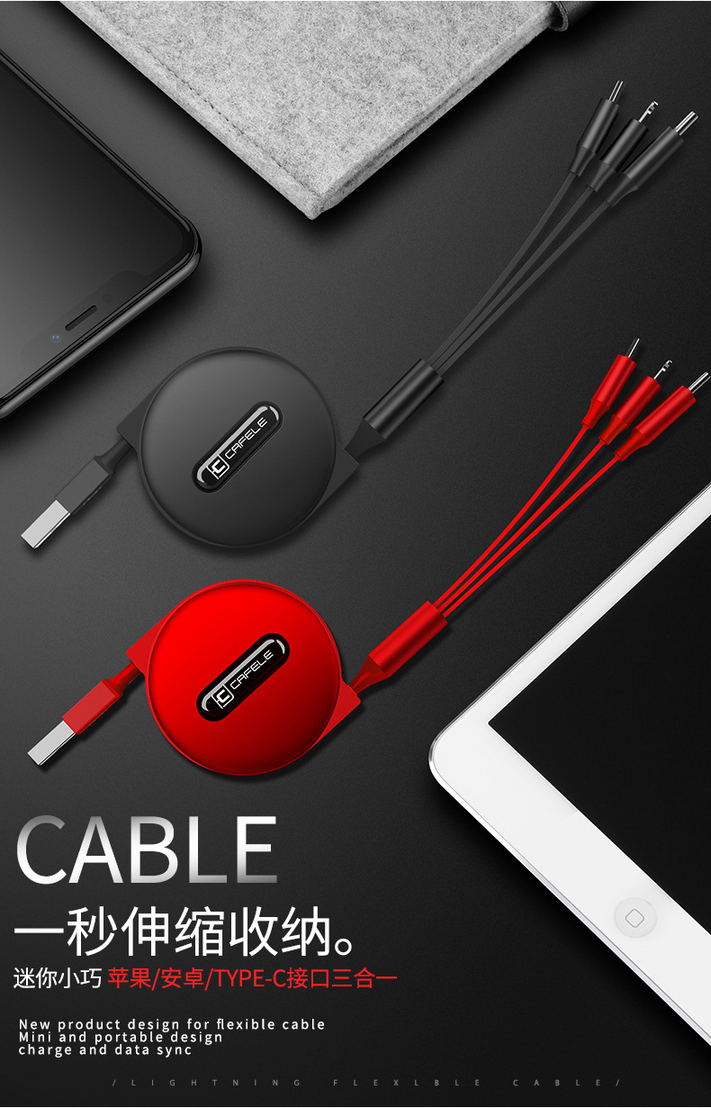 马卡龙三合一数据线 适用苹果安卓typec手机快充电线 多功能伸缩 活动小礼品 宣传礼品