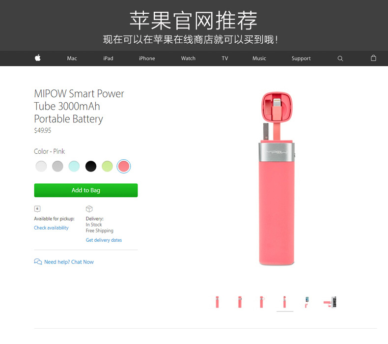 商品名称:Power Tube便携智能移动电源 苹果认证 时尚小巧充电宝 3000毫安