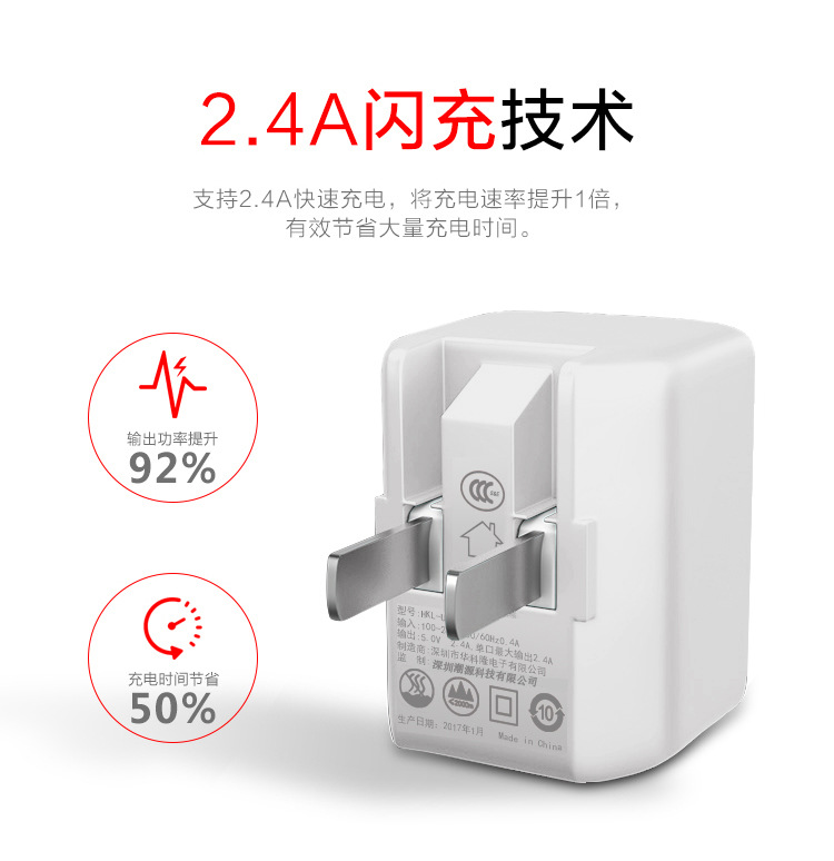 商品名称:双口USB 手机充电器折叠脚 2.4A智能快充充电头分线器 活动小赠品
