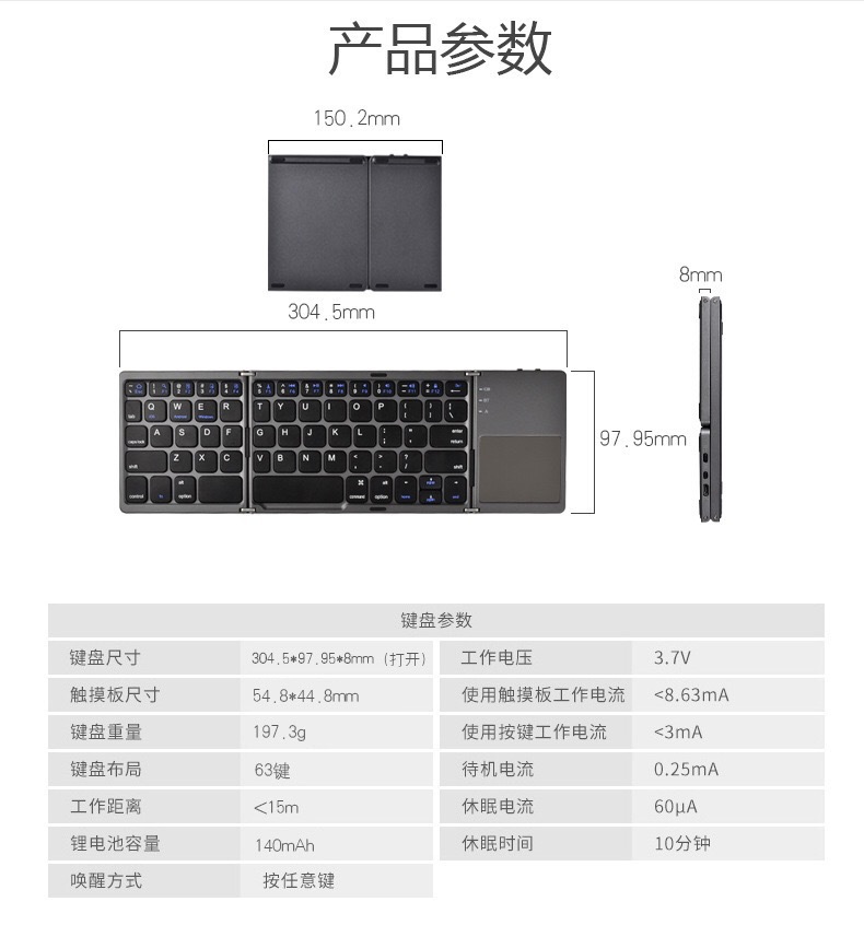 商品名称:无线蓝牙折叠键盘 超薄便携三折键盘 数码礼品定制