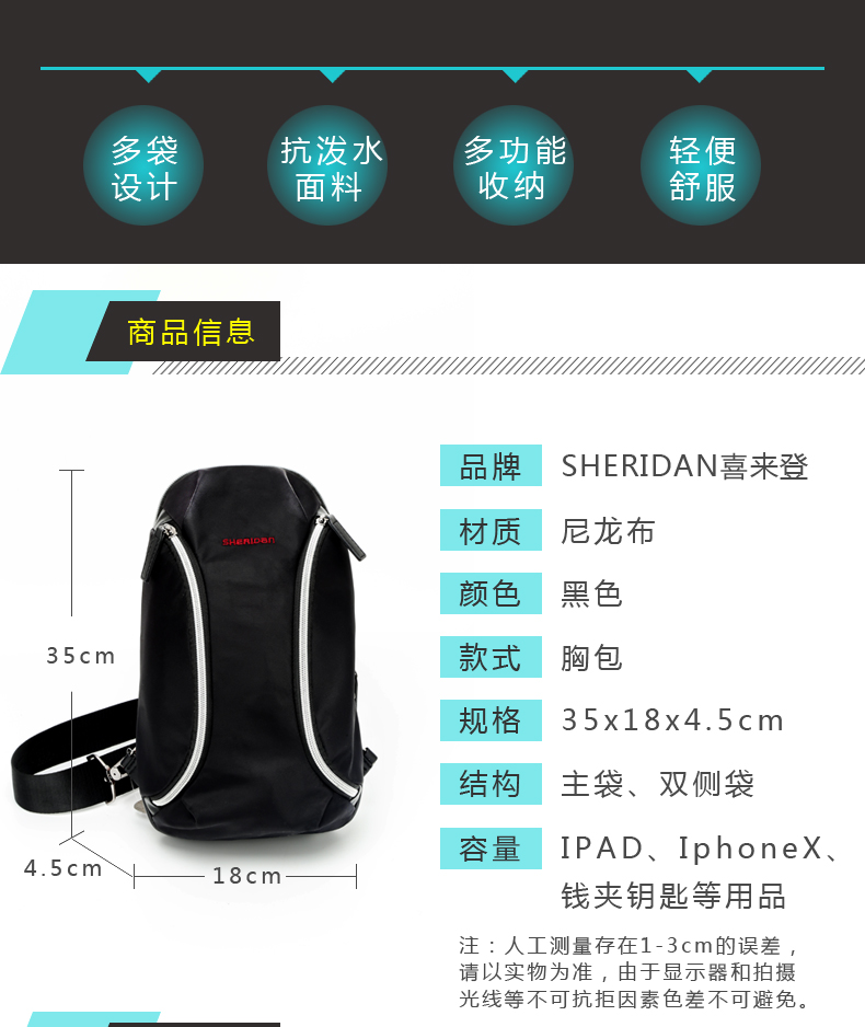 商品名称:喜来登 简约休闲单肩胸包 防水耐磨尼龙布 收纳方便多种功能 公司活动奖品设置