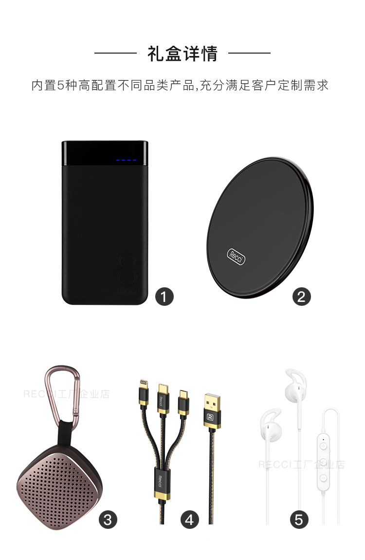 商品名称:Recci 尊享大礼盒 移动电源+无线充电板+蓝牙音箱+数据线+蓝牙耳机 年会抽奖奖品推荐