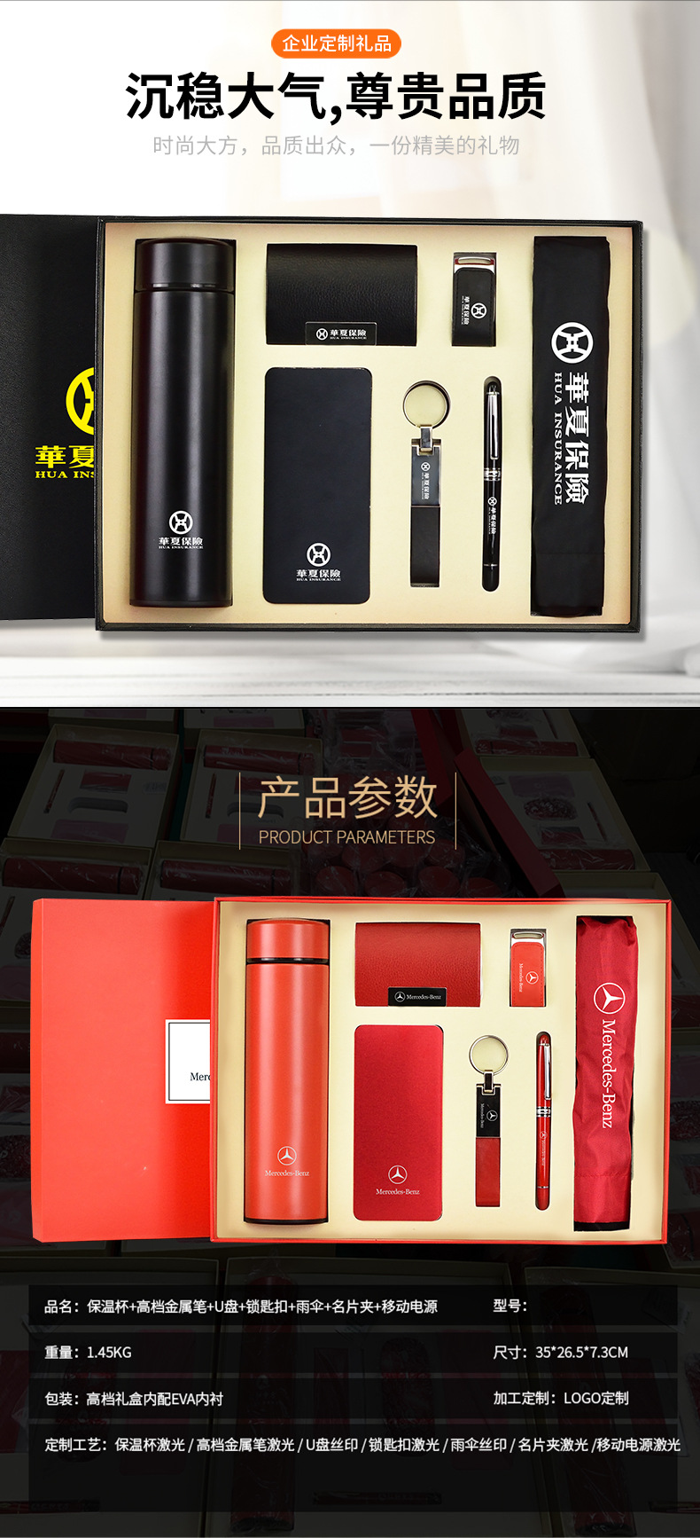 商品名称:商务礼品七件套 保温杯+雨伞+钥匙扣+名片夹+签字笔+充电宝+U盘组合礼盒套装 简约商务礼品