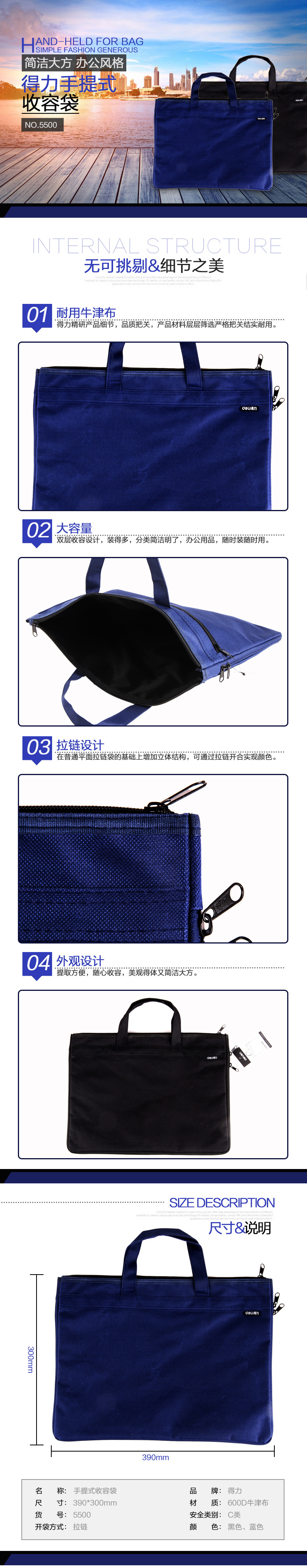 商品名称:得力(deli)商务简约牛津布大容量手提拉链袋