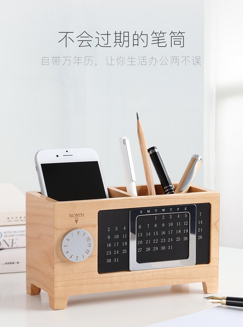 创意木质大容量笔筒(胡桃木) 多功能万年历桌面收纳盒 办公用品笔座 生活创意礼品