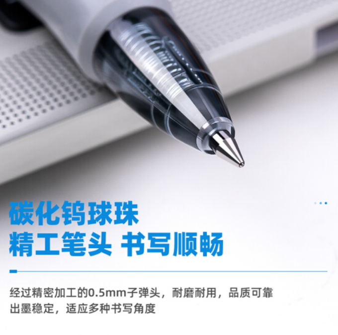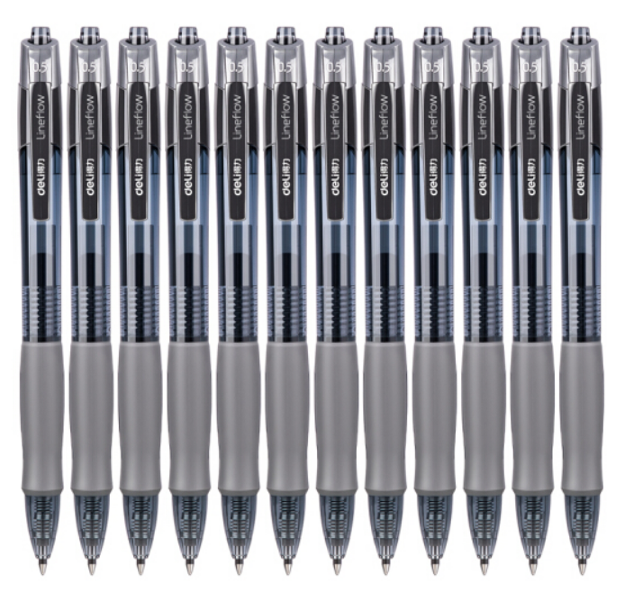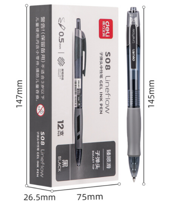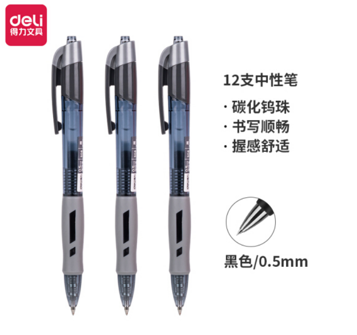 商品名称:得力(deli)臻顺滑中性笔签字笔 0.5mm子弹头按动笔水笔 办公用品 黑色 12支/盒S08