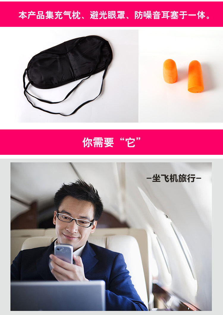 商品名称:户外旅行充气枕头 旅游三宝 U型枕眼罩耳塞组合套装(配收纳包)