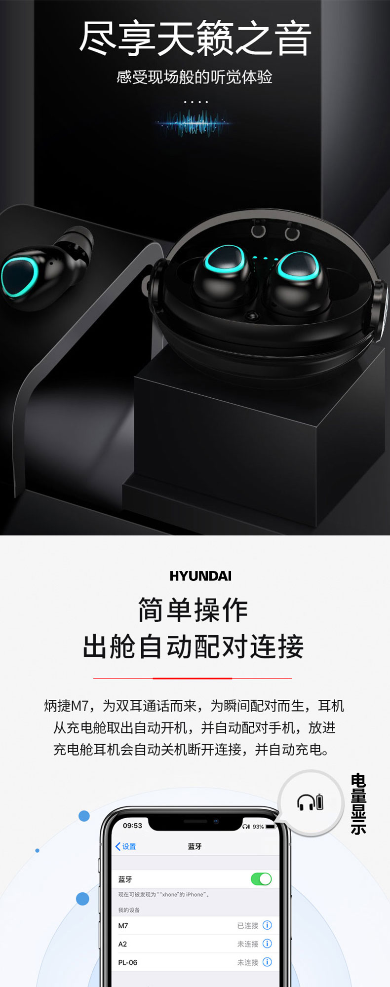 商品名称:HYUNDAI/现代 便携小巧随身收纳无线蓝牙耳机 防水防汗运动耳机定制 趣味运动会奖品 户外小礼品