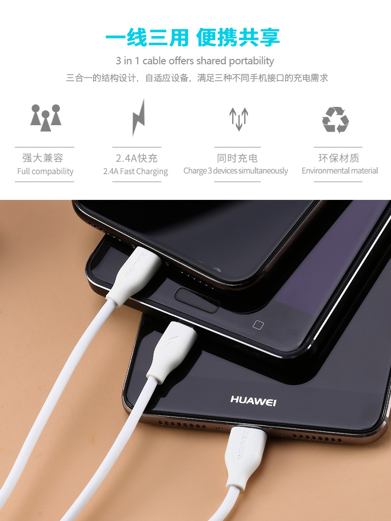 商品名称:REMAX 速达一拖三充电线 万能通用款2.4A快充线 商场促销赠品 房地产销售礼品