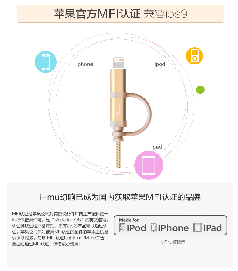商品名称:幻响(i-mu)苹果MFI认证数据线充电线安卓usb手机ipad充电线 公司礼品推荐