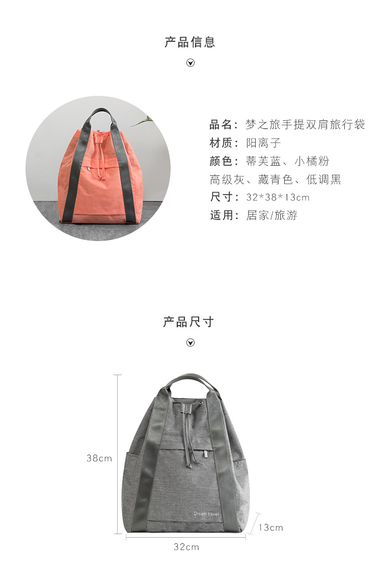 商品名称:北欧文艺多功能收纳包 时尚简约手提双肩旅行背包 短途旅行包